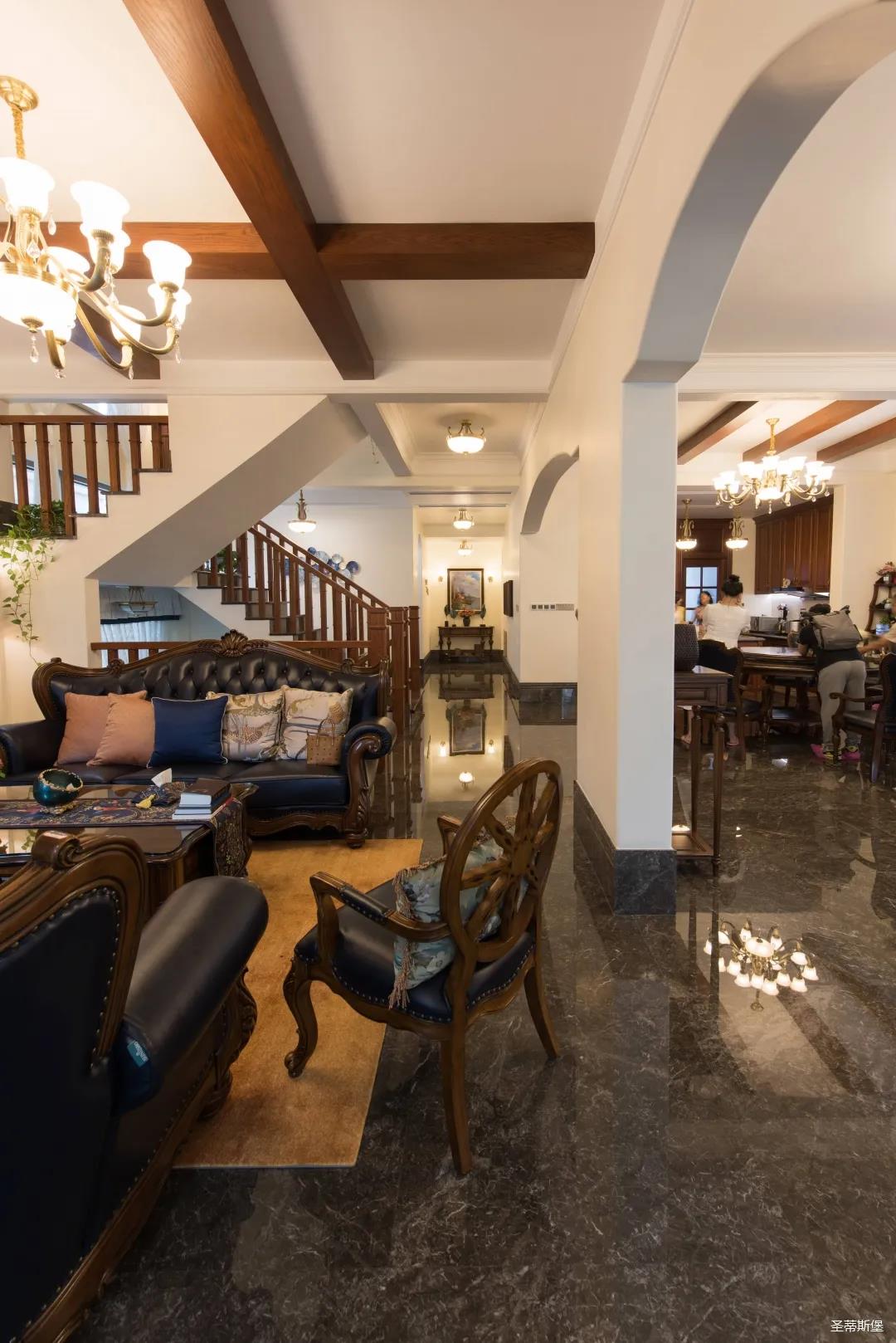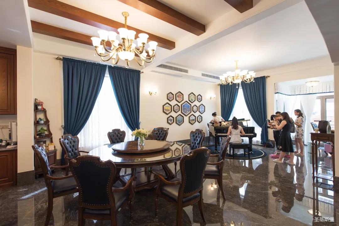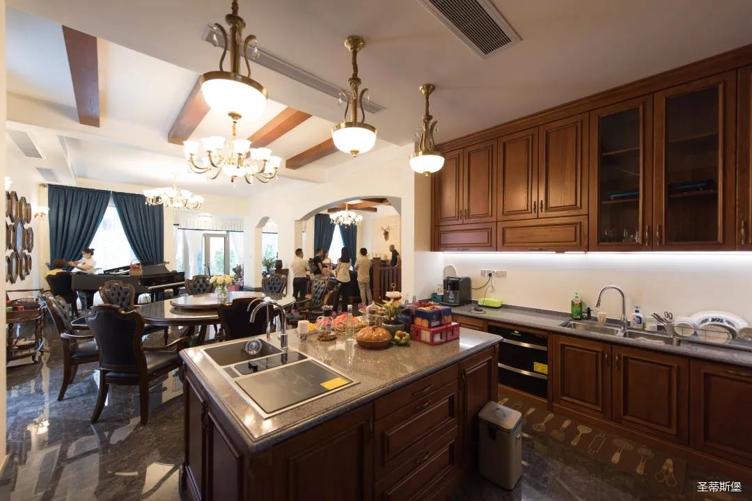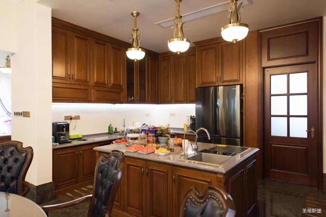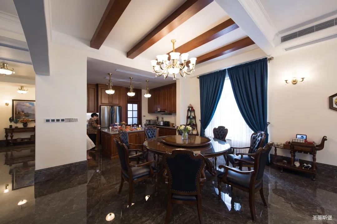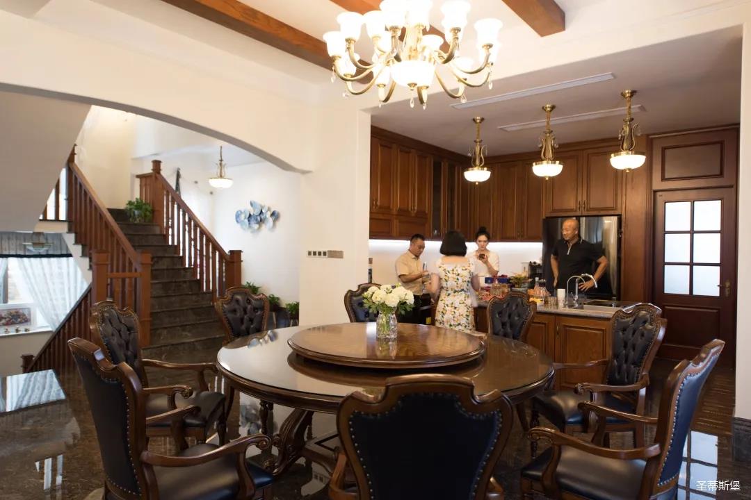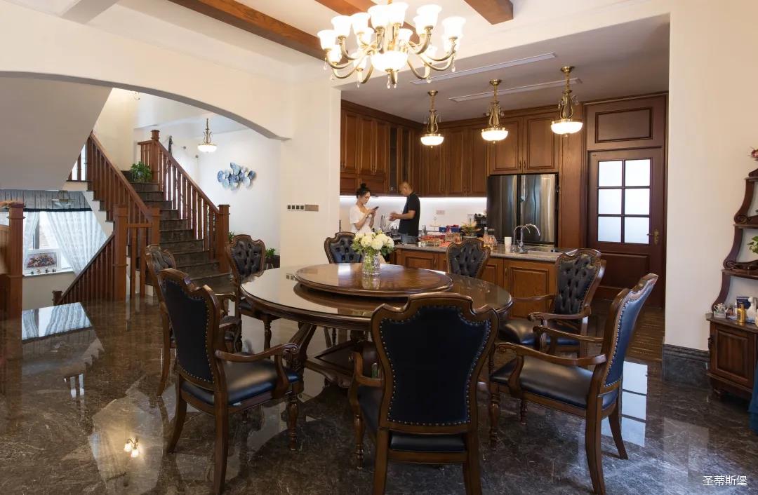 玄关进入转角处,以稳重大气实木为主色调的开放式中西餐厨空间,将一体化无隔断设计贯彻到每个细节,采用了亲肤真皮质感的餐椅,手工雕刻的曲线让原本硬朗的空间变得格外优雅,自上而下,构成完整的美式空间气度,在每天的生活点滴间,沉浸在美式风情中,更加随性舒适。
