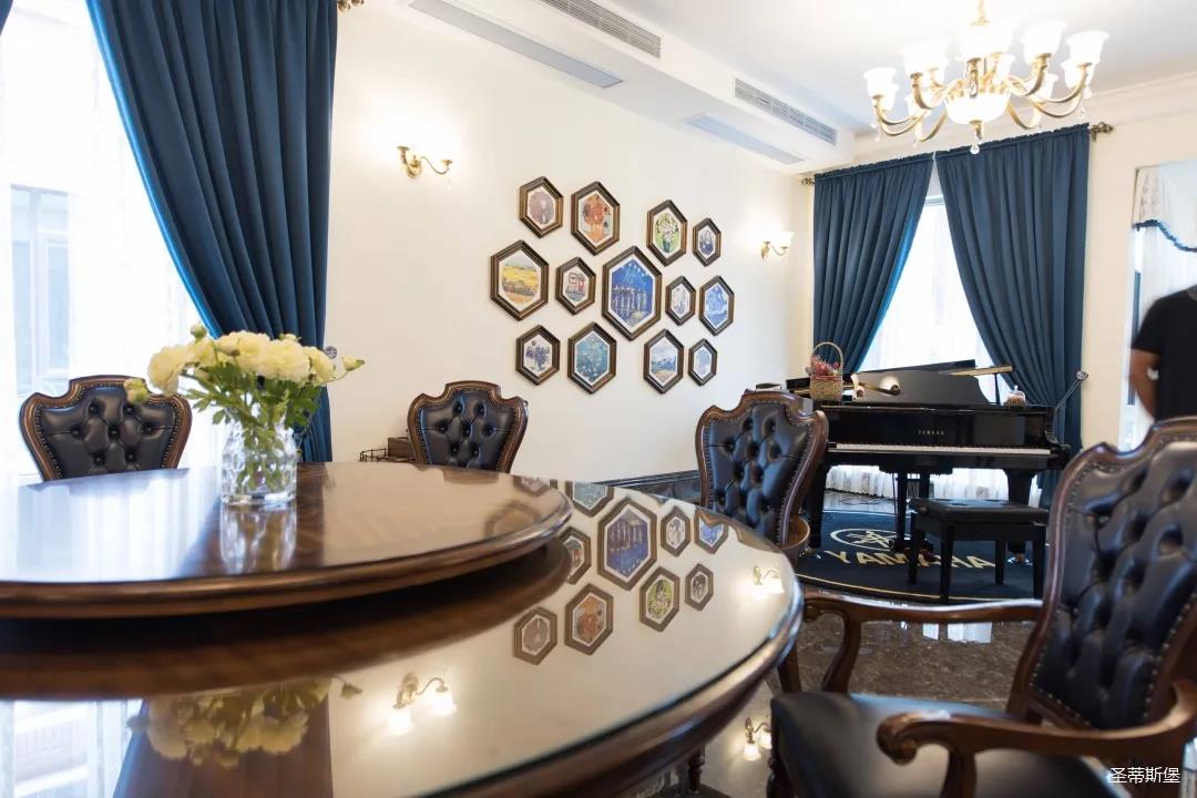 业主喜欢沉稳的美式新古典风格,整体统一的色调,呈现了一种庄重的典雅感。醇厚的实木真皮沙发,以古典的手法描绘出一种略带复古的时尚奢华。一抹深蓝迂回婉转映照着空间的色系,明暗相对,符合着现代审美,却又不显沉闷。转角处的一台复古唱片机,还原了对音乐倾心的浪漫,抬起拨杆将唱针落下,随着唱片的转动和音乐的响起,美好的一天就此开始。