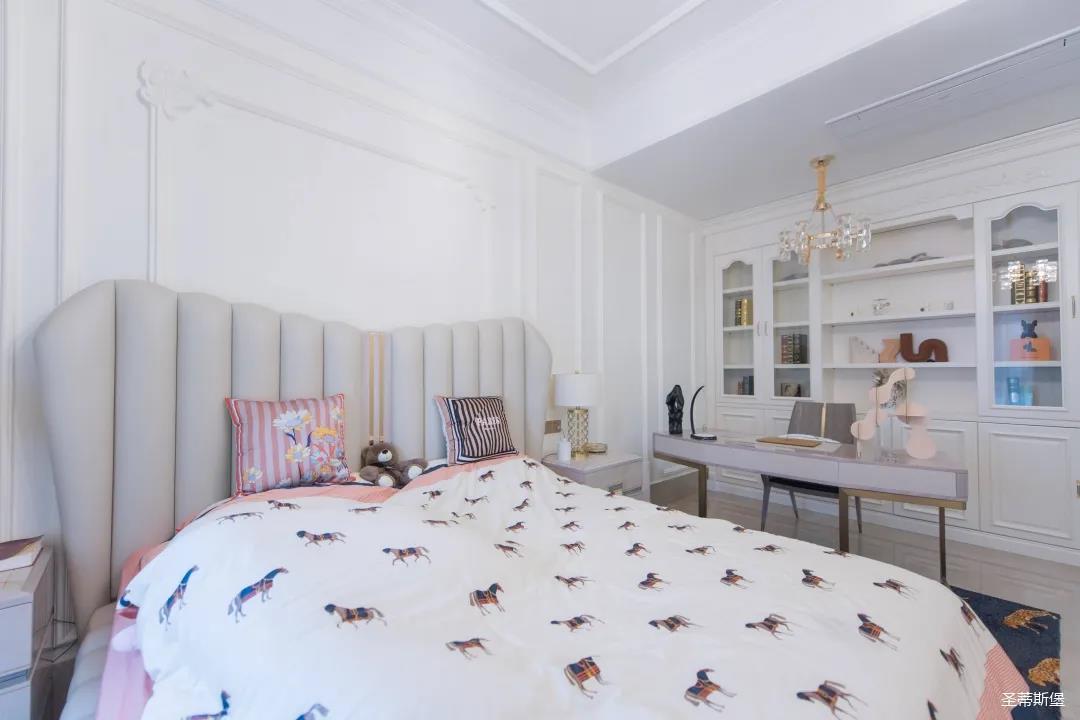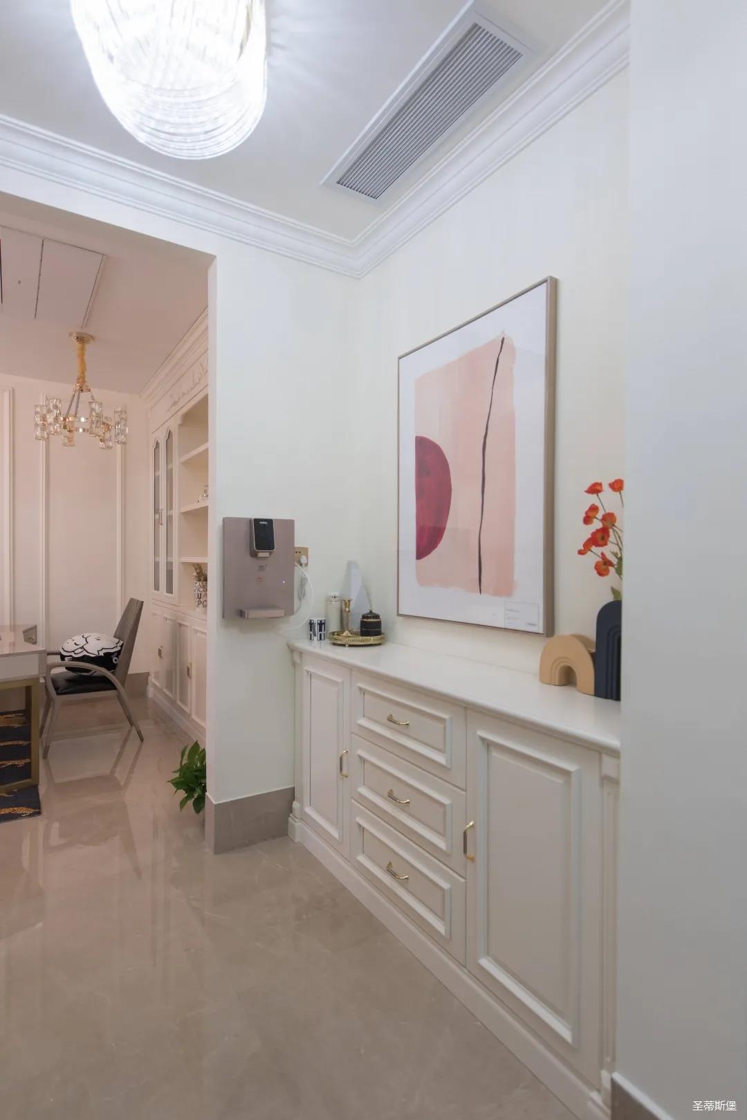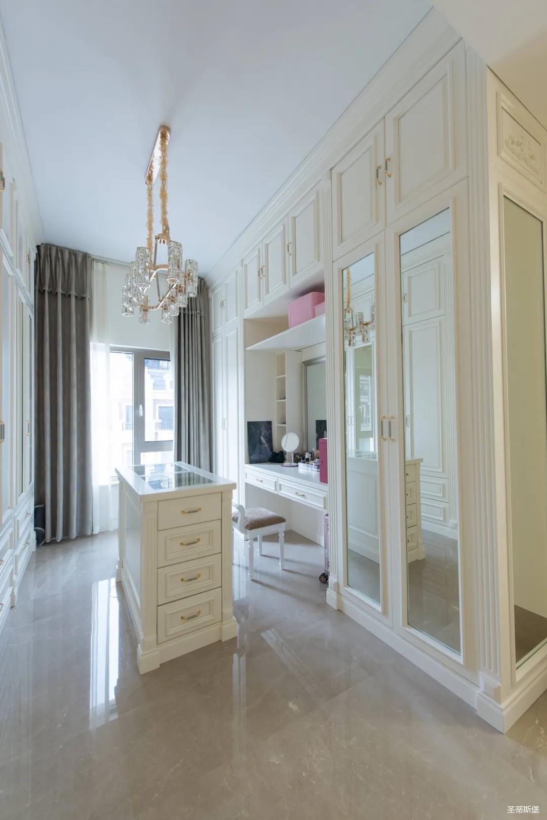 经过房间玄关过道,一眼就被这梦幻的景象给征服,摒弃繁杂,少许的金色元素点缀,予以空间轻奢细腻的质感,却又不失美式韵味。